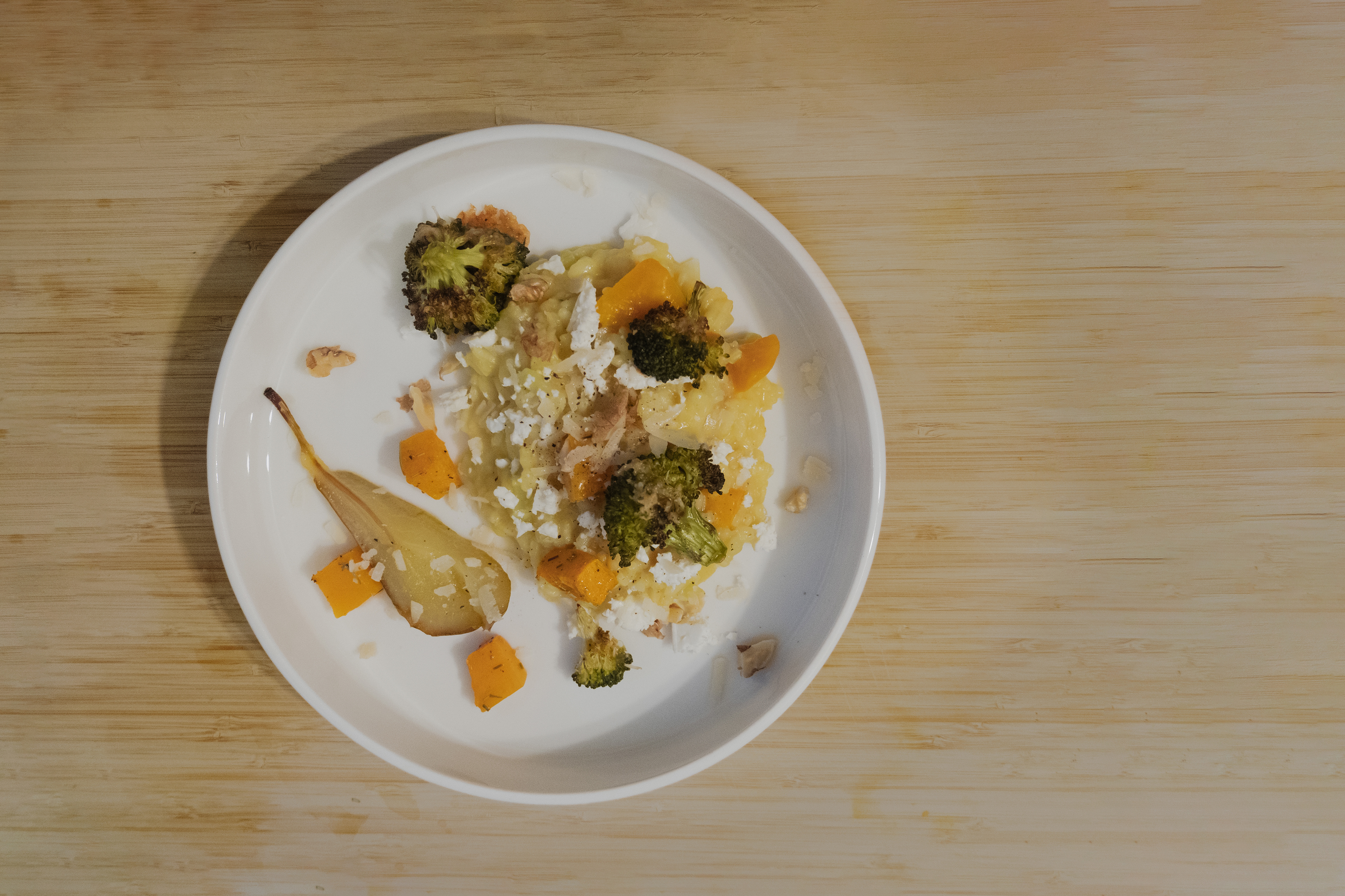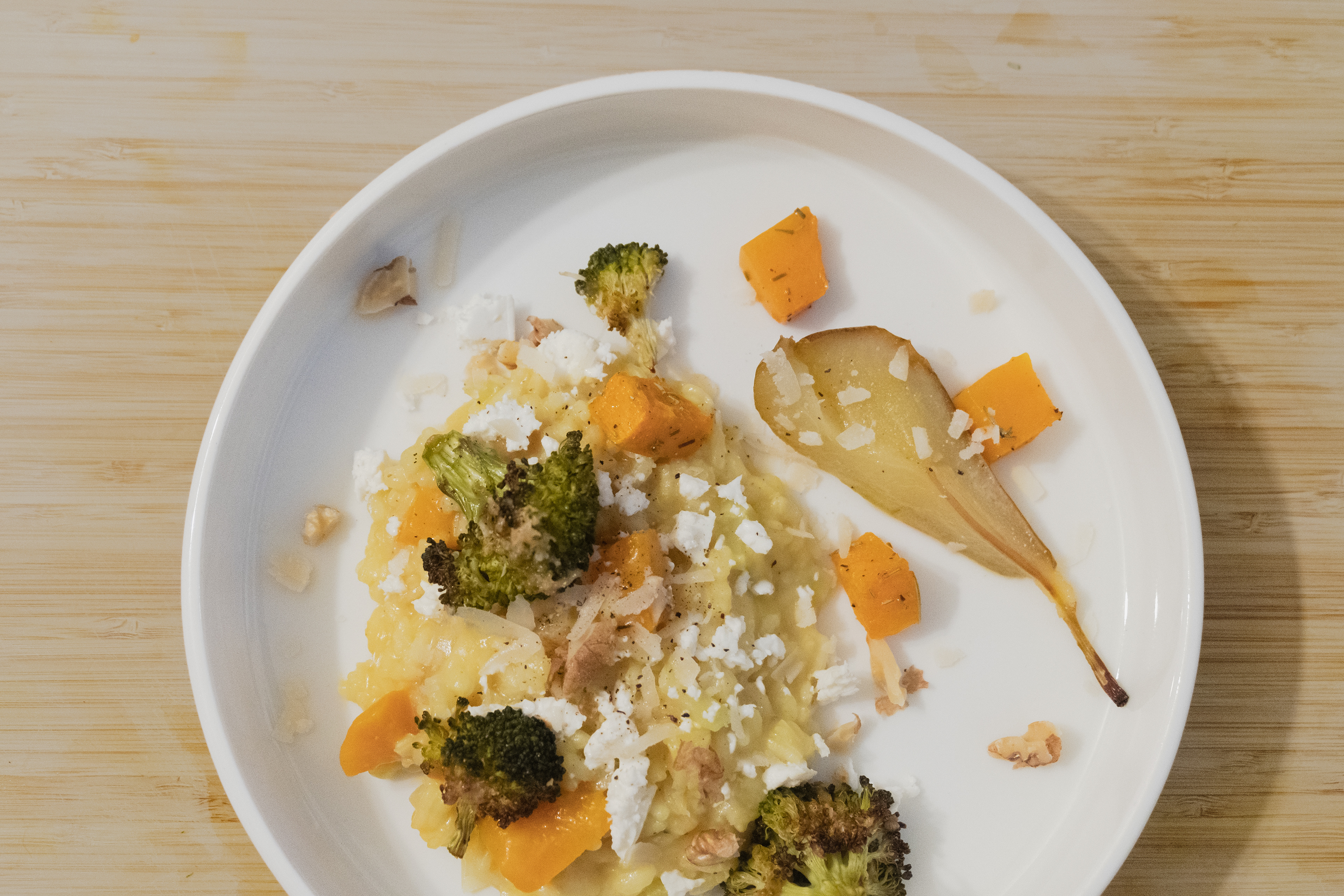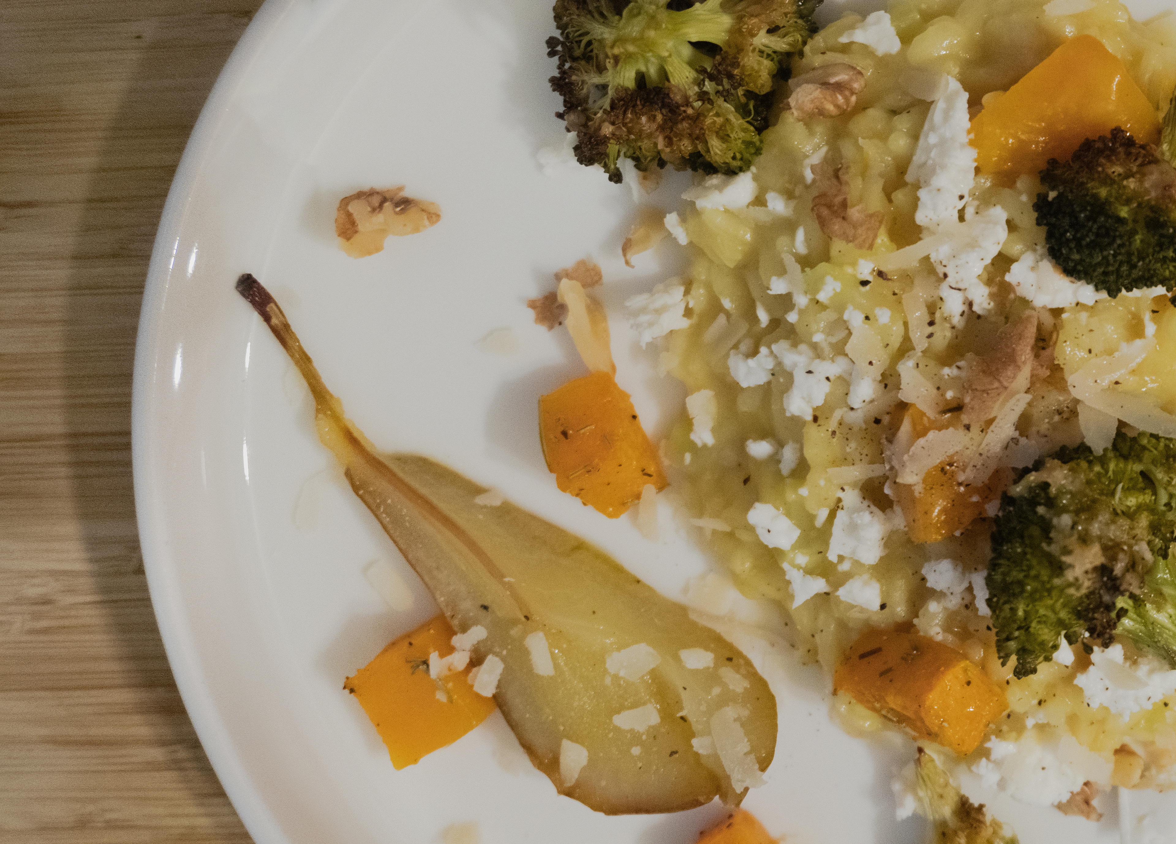 Roasted squash risotto w. rosemary, roasted parmesan broccoli, and honey pear topped with feta and nuts.